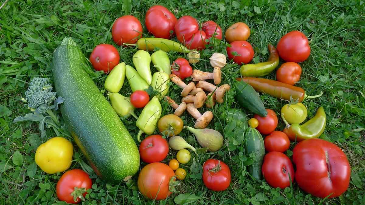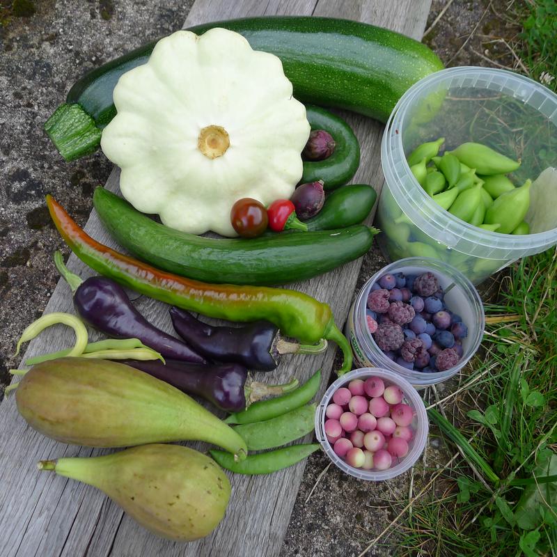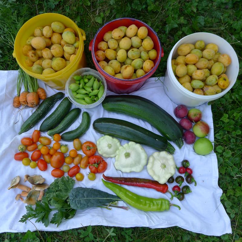 Sklízím okurky, papriky, rajčata, cuketu, mangold, mrkev, brokolici, ačokču, brambory, cibuli z výsevu, petrželku, lichořeřišnici, šalvěj, kanadské borůvky a občas nějakou ostružinu a stáleplodící jahodu.
