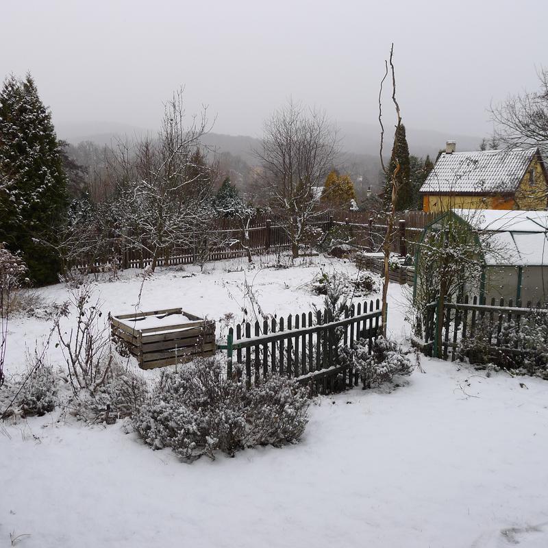 Muškáty už opravdu uklízím do chodby, česnek jsem před nasněžením vysadit stačila, listí pohrabat ne, z vrby ještě ani neopadalo. Na zahradě dnes udělám jen pár fotek, nakrmím kosy a pak rychle do tepla pojíst lívance s domácí marmeládou.
