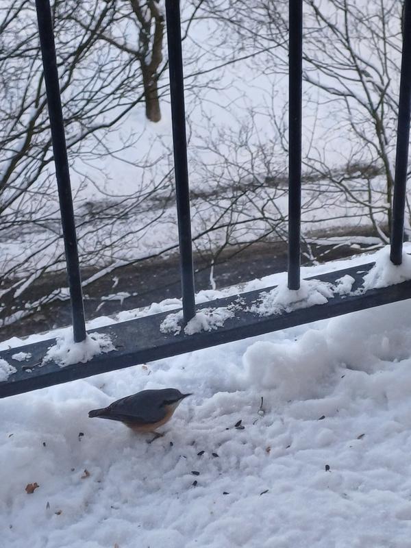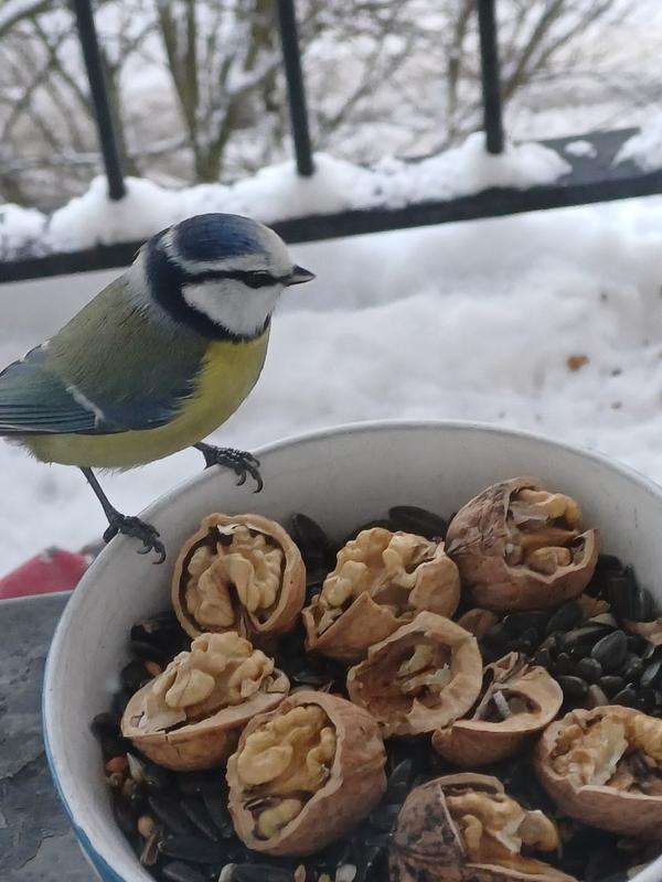 Na zahradě je spousta sněhu a tak sem chodím jen krmit a pozorovat ptáky. Do krmítka dávám slunečnici a vlašské ořechy, na zem jablíčka, na stromek věším domácí lojové koule. Ptáky krmím i na balkoně, tam je mohu pozorovat zblízka z tepla domova.