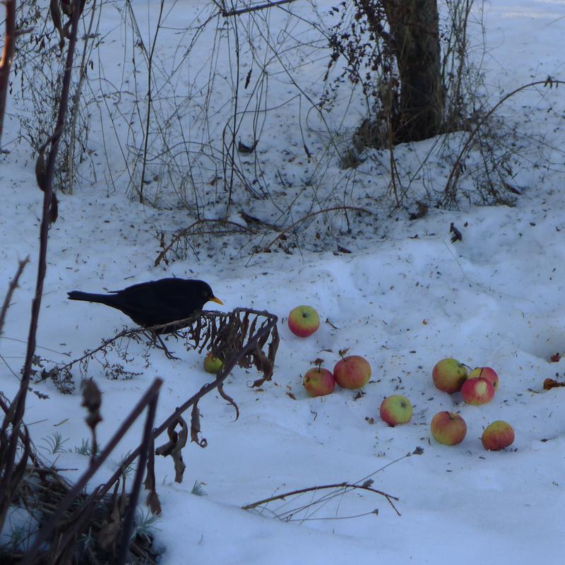 Na zahrádce mi letos zrovna ke sklizni nic neroste, jen ve skleníku posledních pár pórků, růžičková kapusta a petrželka. Přesto tam však pravidelně chodím se zbytky na kompost, sypat zrní sýkorkám a pro jablka do sklepa. Nějaké vždy hodím i kosům, moc jim chutnají a na oplátku mě pak potěší zvláště na jaře svým zpěvem.
