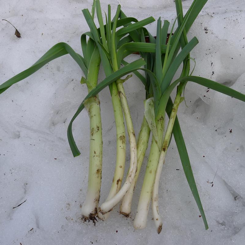 Na zahradě sníh pomalu roztává, ale půda je ještě zmrzlá. Na sklizeň pórku ve vyvýšeném záhoně si tedy musím počkat, ve skleníku však již jde vytrhat dobře. Na uvolněné místo vysévám ředkvičky, k oziménu salátu, špenátu a cibuli přidávám na závlahu sníh.
