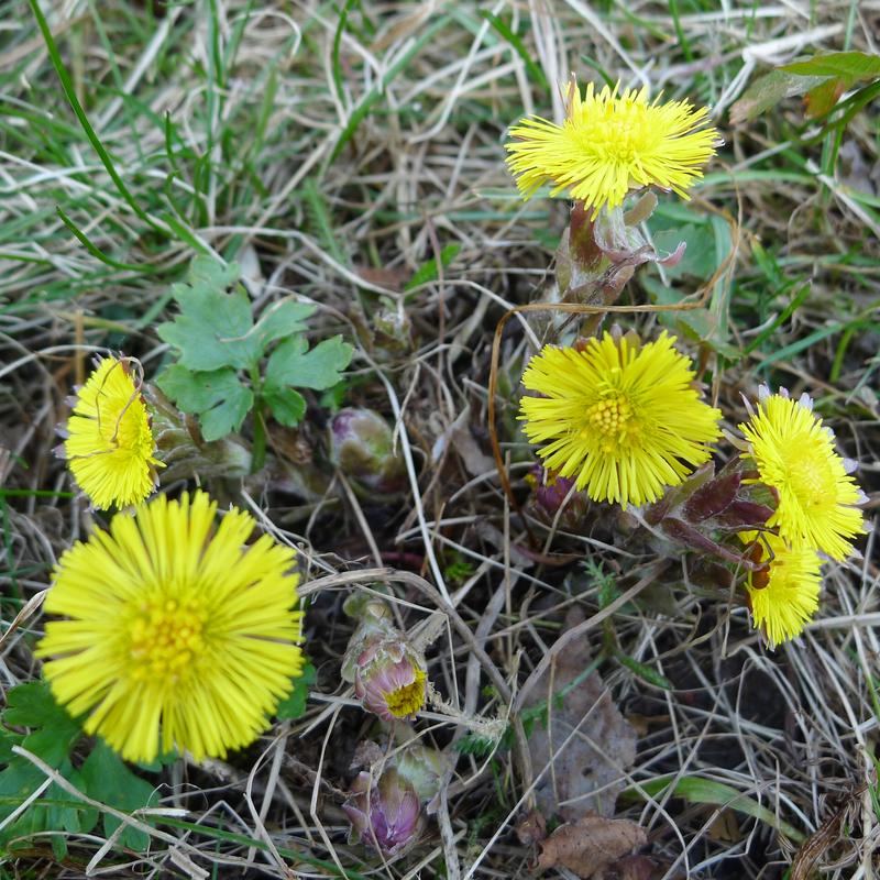 V osluněné části zahrady už kvete podběl, jinde ještě čekají sněženky na osvobození od suchého listí pod sněhem.