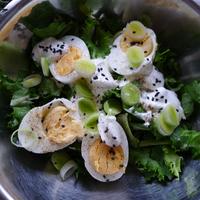 Listy endivie trochu pokrájet, přidat tatarku nebo kysanou smetanu, vařená vejce, osolit, okořenit paprikou, pepřem, posypat sezamovým semínkem a pórkem.